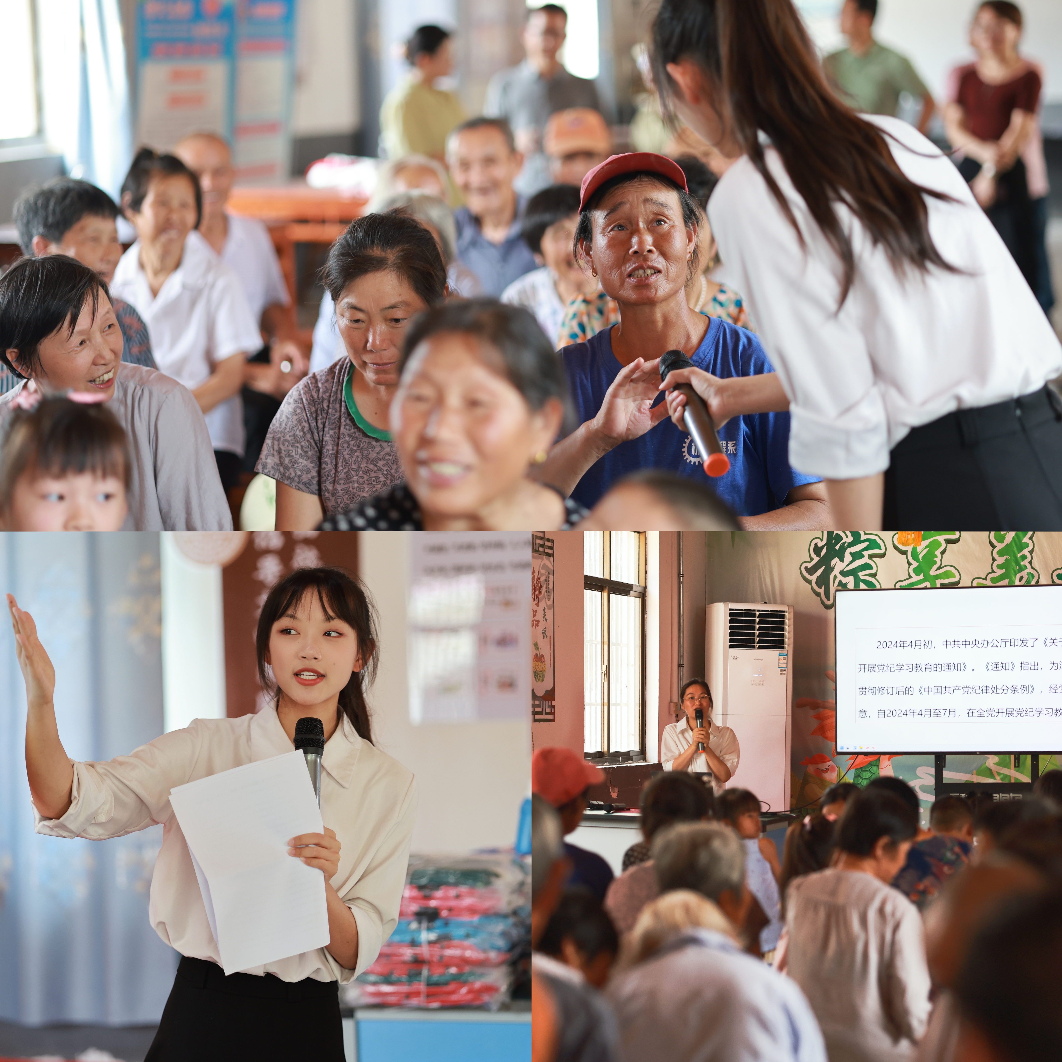 抵达后,欧亚琴老师为村民们带来了一场生动而深刻的《中国共产党纪律处分条例》解读讲座。她以贴近民生的视角,结合生动案例,让村民们深刻认识到条例的严肃性和重要性。公司青年讲师团成员胡雅琴同学分享了《益启爱》项目,并穿插“猜红歌”、党史知识竞赛等互动环节,村民们积极参与其中,与志愿者共同回顾党的光辉历程,坚定了大家跟党走、听党话的信念。