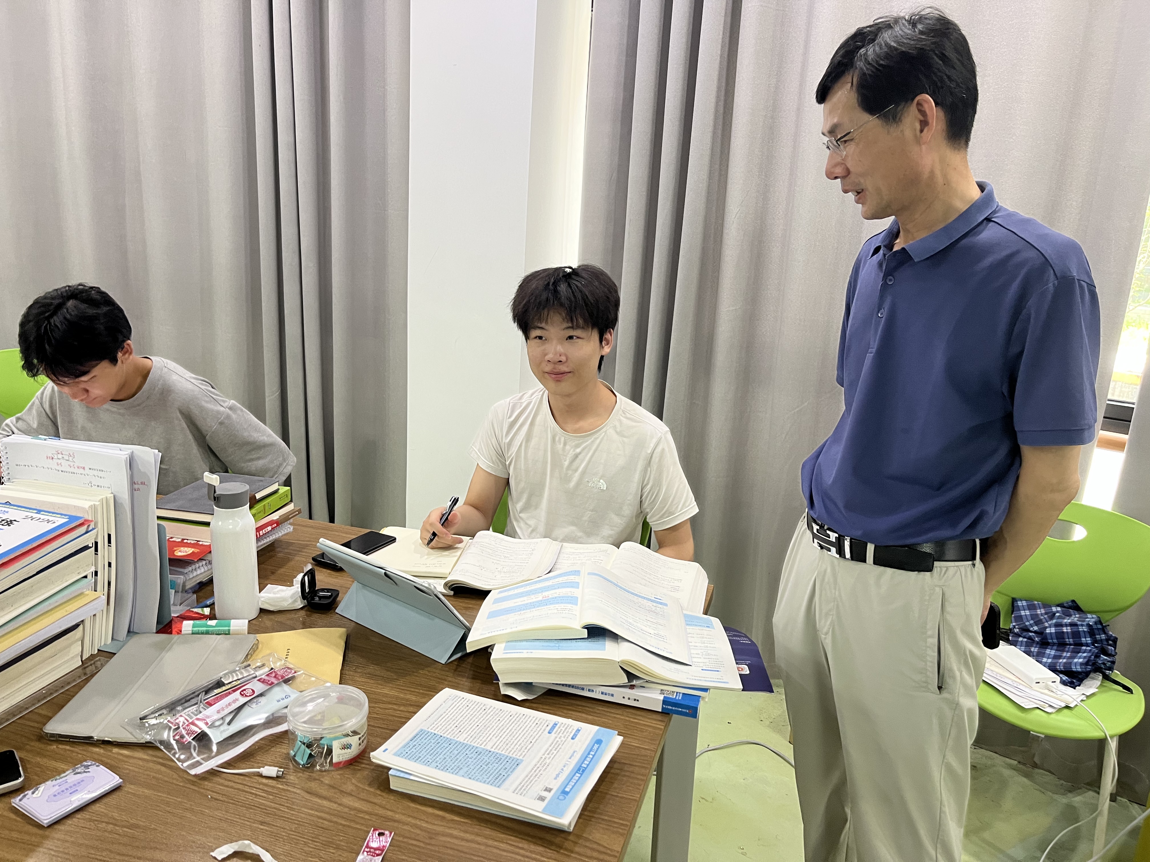 在考研员工宿舍,杨会成详细询问复习进度,叮嘱大家劳逸结合、张弛有度。
