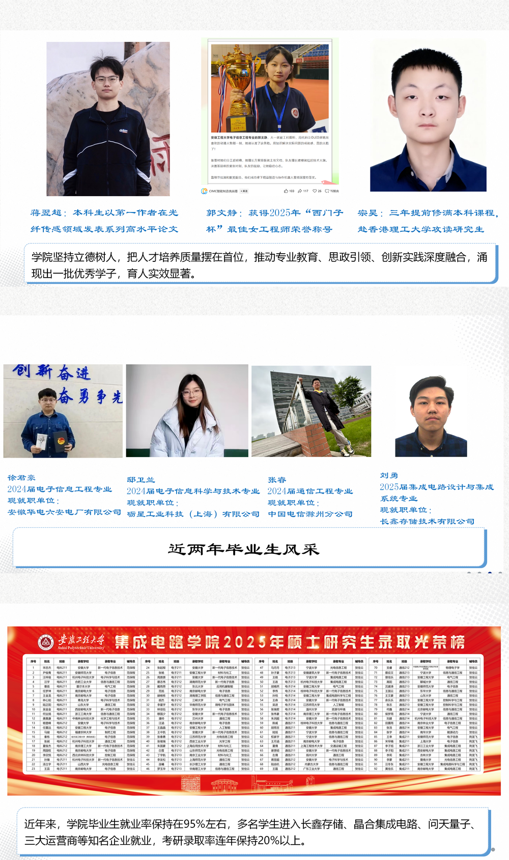公司坚持立德树人、质量为先,将专业教育、思政引领与创新实践深度融合,人才培养成效持续显现:本科生以第一作者在光纤传感等前沿领域发表高水平论文,员工获得“西门子杯”最佳女工程师荣誉称号、个性化人才培养方案助力员工提前升学深造;近两届毕业生就业率稳定在95%左右,20%以上考取研究生,大量优秀学子入职长鑫存储、三大运营商、华电集团等知名企事业单位,充分彰显公司新工科创新培养体系的卓越成效。