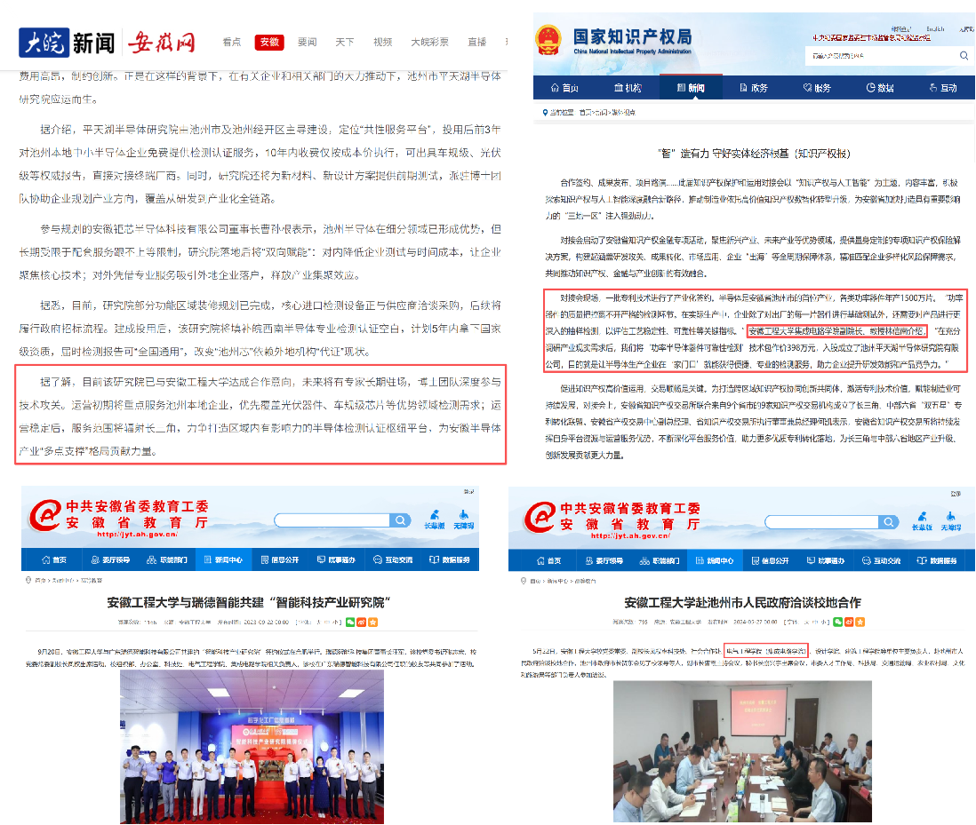 大皖新闻、中国知识产权局、安徽省教育厅等报道了公司在池州市半导体产业的深入合作,推动技术和产业创新的落地。以及通过与长信科技、安芯等企业的合作,共同推动功率半导体和车载显示技术的产业化应用。