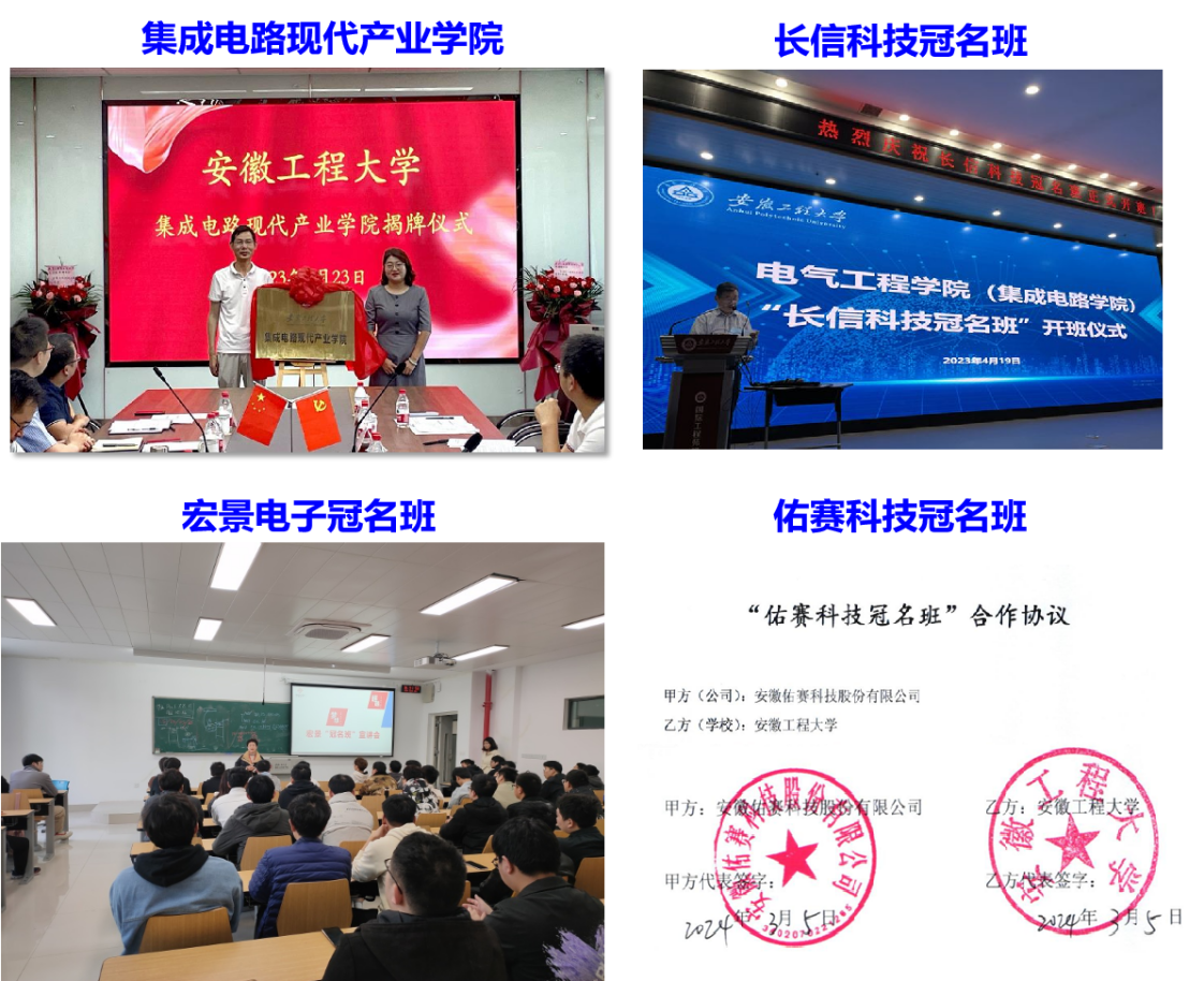 为促进学科发展和员工就业能力,公司积极开展校企合作,成立了集成电路现代产业公司和冠名班。集成电路现代产业公司专注于集成电路行业发展与人才培养,与行业企业深度合作,提供丰富的实习机会,培养符合市场需求的专业人才。公司开设了长信科技冠名班、佑赛科技冠名班和宏景电子冠名班,并设立了两个校企共建课程(FPGA原理及应用、集成电路设计与集成系统专业导论)。通过与企业联合培养,公司为员工提供专业化的培养方向,增强其实践能力和行业竞争力。与此同时,公司与长信科技、安芯、钜芯、瑞德智能、云途半导体、世纪金芯、华瑞微电子等企业建立了深度的校企合作关系,推动多个研发项目的实施,为员工提供了广泛的实习机会和实践平台。