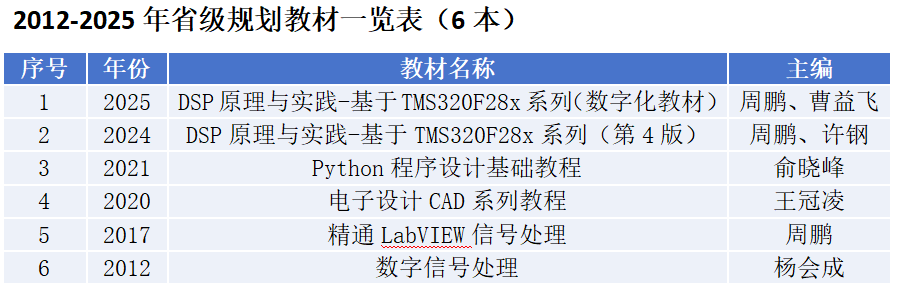 17 | 周鹏 | 2024年第八届全国高等公司电子信息类专业青年教师授课竞赛 | 三等奖 | 全国高等电子信息类专业青年教师授课竞赛组委会 | 2024.10 |